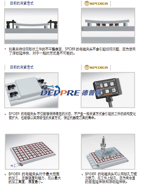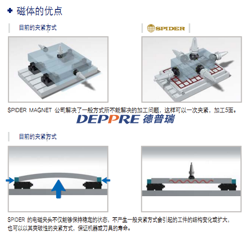 SPIDER MAGNET公司專注于機床的切割工藝的優化,道具的快速負載和卸載,注塑機和沖壓機的模具。因為一般的工作夾緊方式不能滿足客戶的需求,為了緊跟行業發展的速度,需要有一種新的工作夾緊技術,所以,我們公司開發了一種可靠和優異的永久電磁夾頭。當前,大部分好公司使用優質的機床和性能優異的CAD/CAM系統來提高生產力。然而,由于普通的工作夾緊方式能力有限,與機床和CAD/CAM系統的價值不匹配,與不能100%發揮其能力。